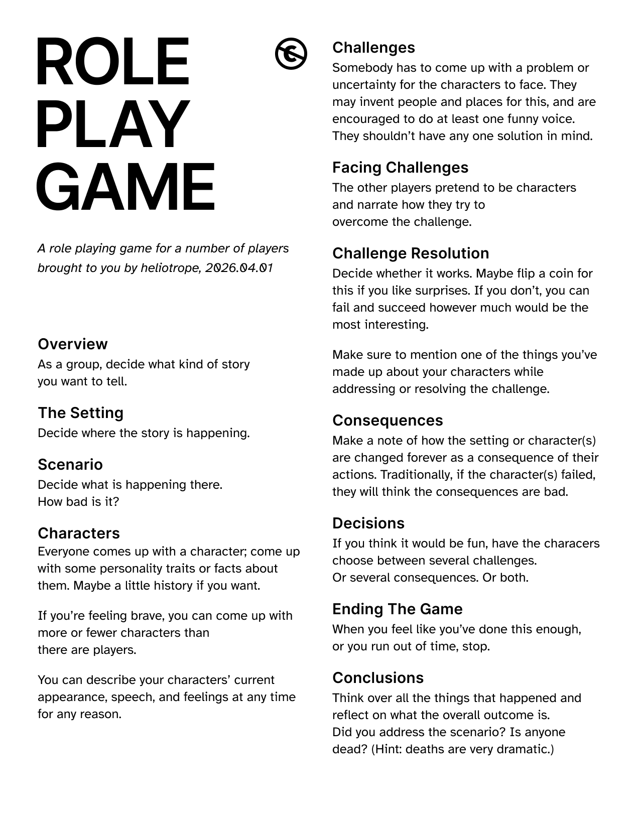 Role Play Game is a free to use tabletop game design placeholder. Anyone is free to take, give, remix, and reuse any part of it. It is released as public domain.