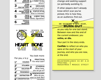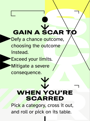 Scars is inspired by the scars system in Infinite Revolution by Gwendolyn Clark, was made for the 2025 ttrpg bookmark jam, is licensed under Creative Commons by attribution 4.0, and is Mosaic Strict.