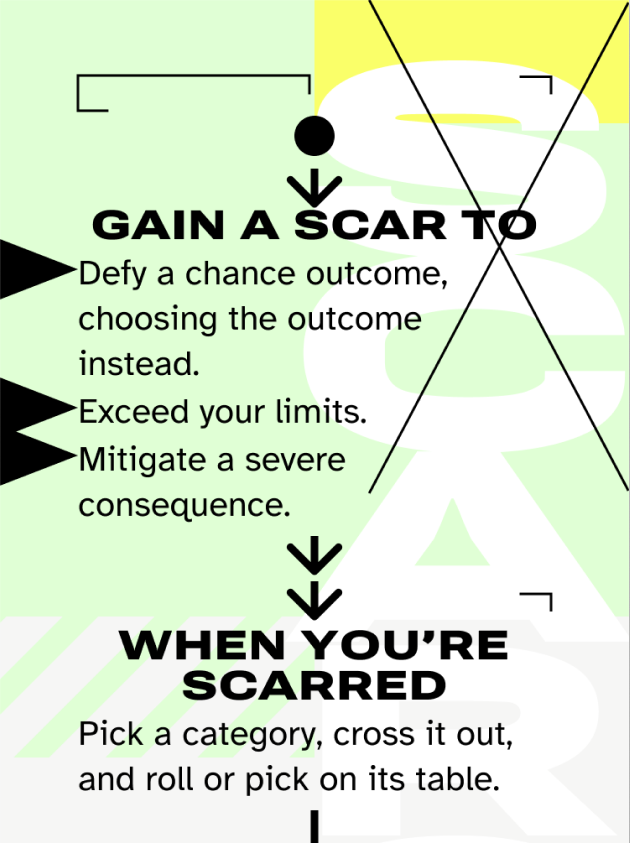 Scars is a tiny module with a loose rules-agnostic framework and a few rollable tables for TTRPG characters to survive adversity by changing.