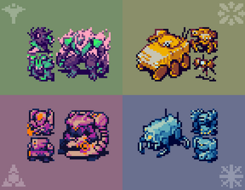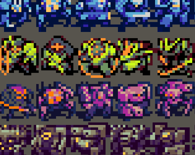 For aficionados of tiny colourful robots, I am pleased to present the complete Sunsprites for Lancer! A set of Lancer NPC tokens, adhering to a strict retro-style 16 pixel grid and 7-tone limited palette, hand-drawn with a focus on contrast and strong shapes to be legible against all kinds of backgrounds.